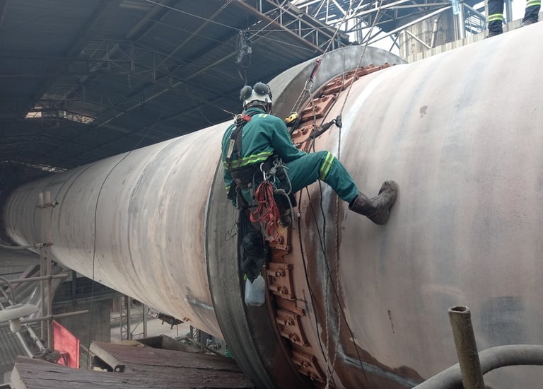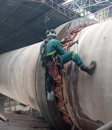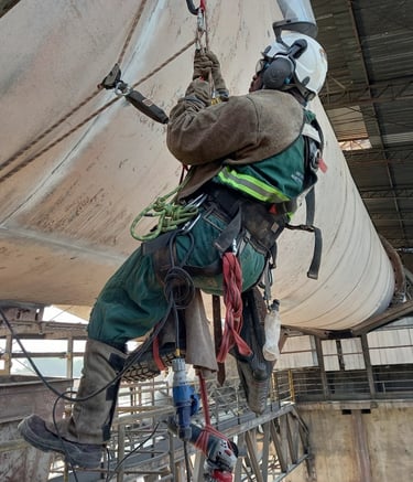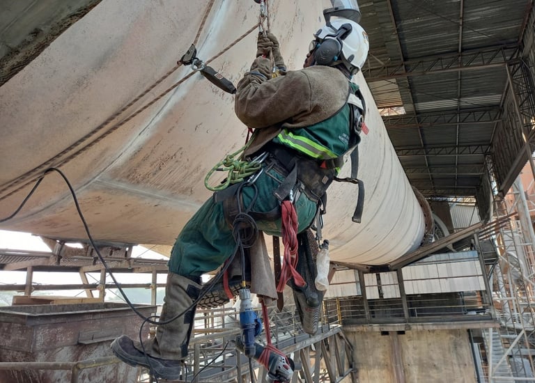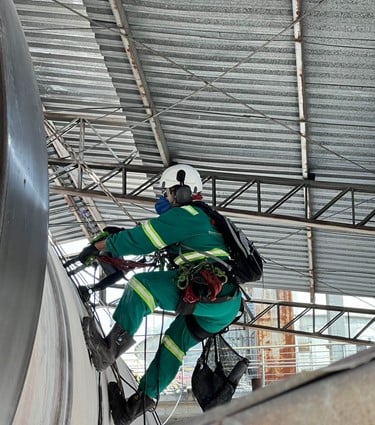Serviços de acesso por corda em pontos de difícil acesso para inspeção e ou manutenção eliminando a necessidade de montagem de andaimes e ou confecção de pontos de acesso, com profissionais qualificados nos níveis 1, 2 e 3 IRATA, sendo caldeireiros, soldadores e habilitados em realizar ensaios não destrutivos e medição de espessuras.